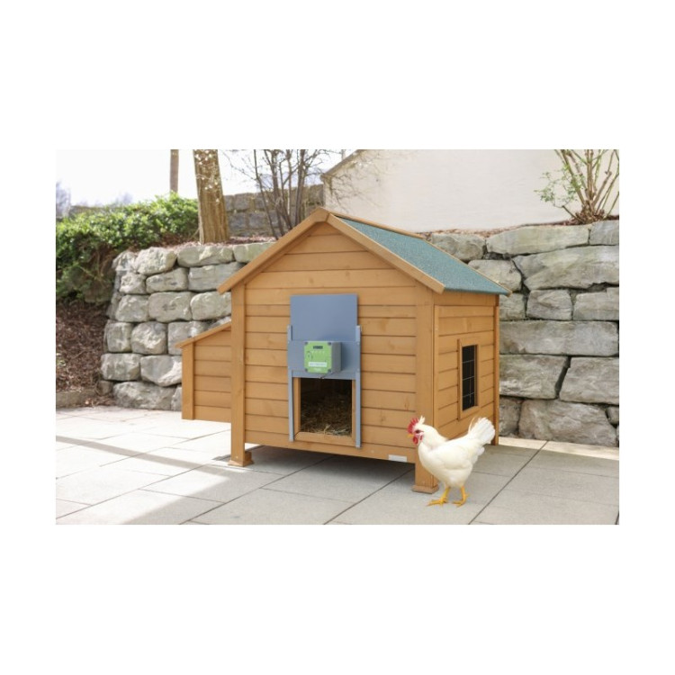 Zintegrowana samoczynna zapadka utrudnia niepożądane otwarcie z zewnątrz i pomaga chronić kurnik przed drapieżnikami.