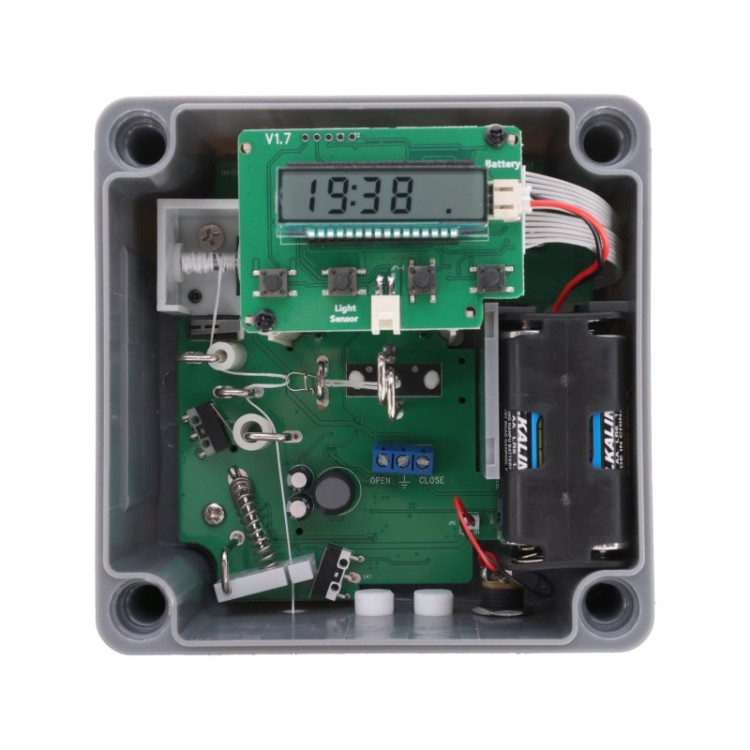 Jednostka sterująca jest już zamontowana na drzwiczkach, czujnik światła ma przewód 1 m dla elastyczniejszego montażu, a wymiary są odpowiednie do małych kurników.