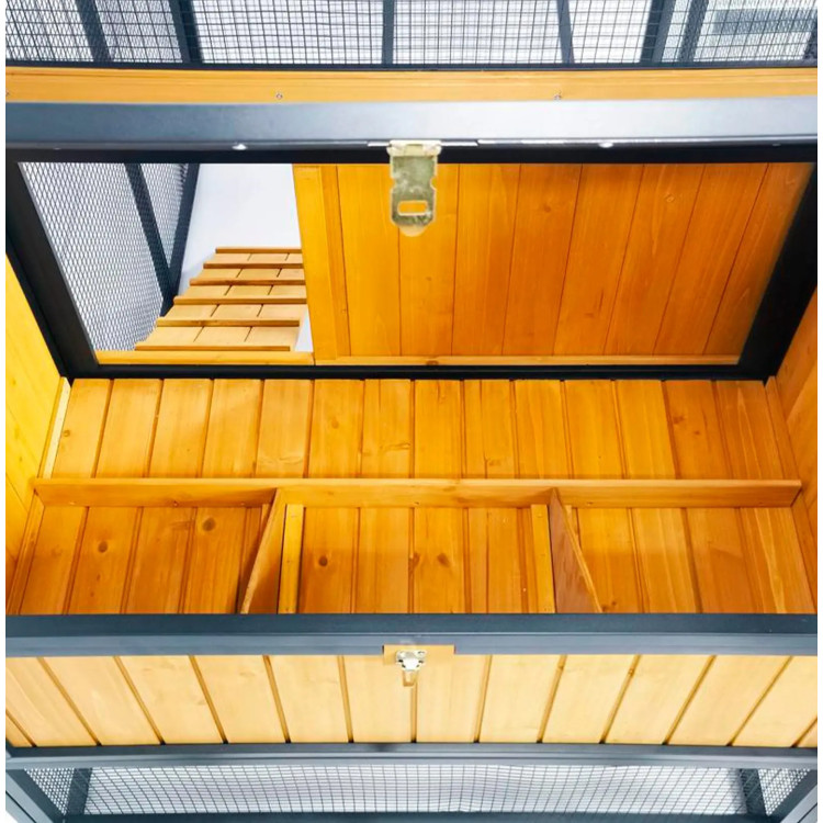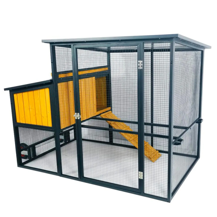 W skład kompleksu wchodzą 3 gniazda do składania jaj oraz zadaszona część przeznaczona do odpoczynku i grzędowania.
