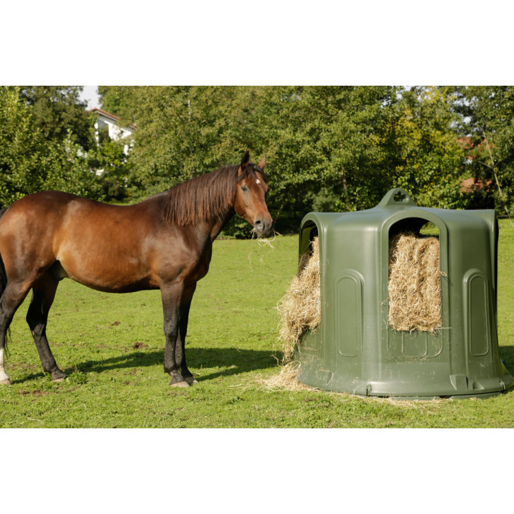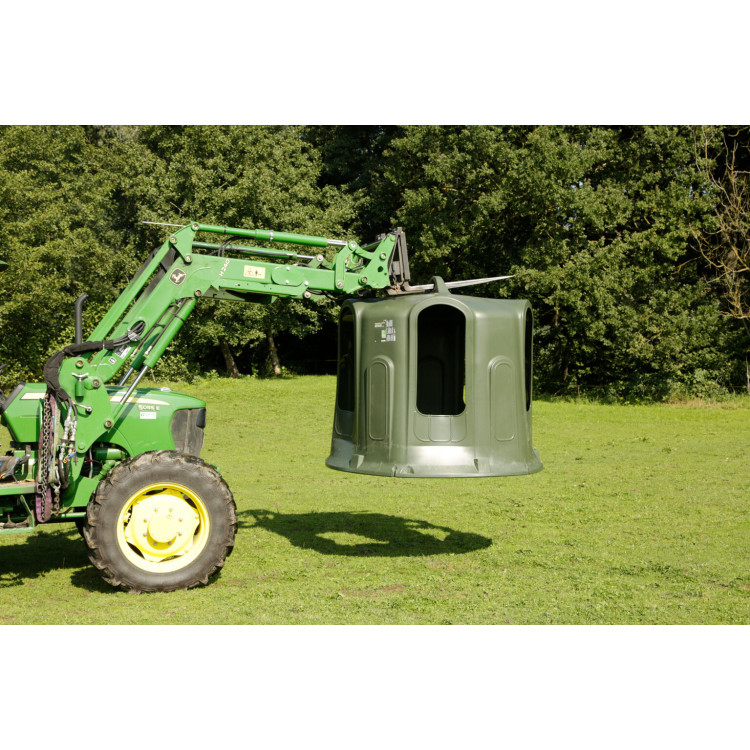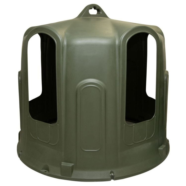 Plastikowy dzwon paszowy do karmienia bydła i koni z bel okrągłych siana. Dzięki 5 bezpiecznym otworom paszowym zwierzęta mają wygodny dostęp, a stabilna konstrukcja utrzymuje dzwon pewnie na miejscu. Do użytkowania na zewnątrz – wykonany z wytrzymałego tworzywa z ochroną UV, z rynienkami odprowadzającymi wodę nad otworami. Przenoszenie ułatwia zintegrowane ucho podnoszące pod widły ładowacza czołowego.