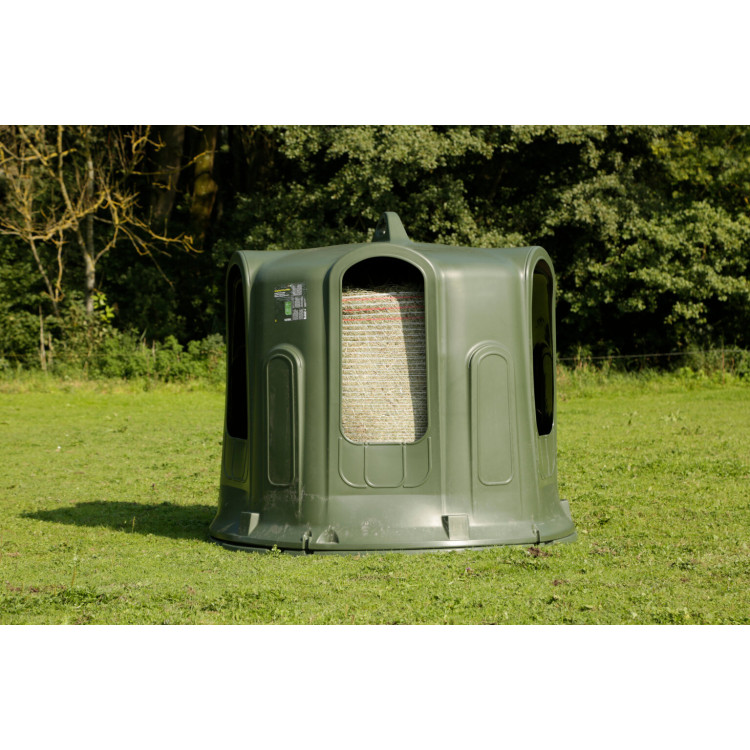 Gdy potrzebujesz, aby miejsce karmienia stało stabilnie w jednym punkcie, skorzystasz ze zintegrowanych uchwytów mocujących do zakotwienia w ziemi. Dla lepszej ochrony beli można dokupić dno (sprzedawane osobno), przeznaczone do suchego przechowywania beli i z możliwością zamknięcia na czas transportu siana.