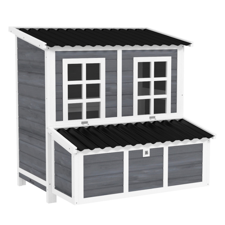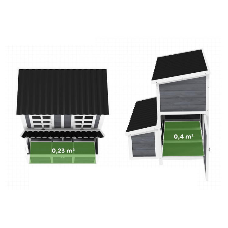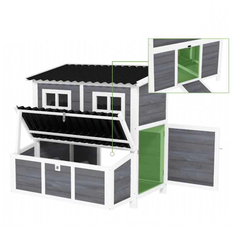 Dzięki dwóm drzwiom wejściowym i rampie Kury mogą swobodnie i bezpiecznie przemieszczać się między kurnikiem a terenem zewnętrznym. Wewnętrzne grzędy zapewniają wygodne miejsce do odpoczynku i snu, a okna zapewniają dużo światła i pozwalają na kontrolę stada bez niepotrzebnych zakłóceń. Kurnik wykonany jest z wysokiej jakości litego drewna jodłowego i zabezpieczony powłoką wodoodporną , co wydłuża jego żywotność. Podwyższona konstrukcja chroni konstrukcję przed wilgocią z gruntu i poprawia cyrkulację powietrza. Plastikowy dach zapewnia niezawodną ochronę przed deszczem i niekorzystnymi warunkami atmosferycznymi.