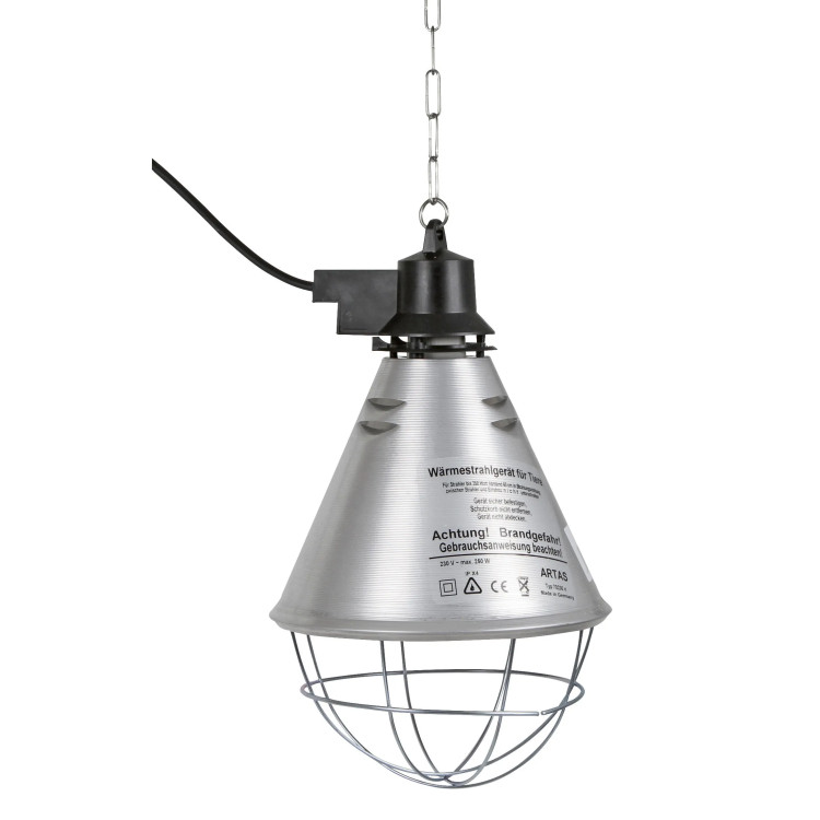Lampa podczerwieni typu Artas służy do dogrzewania zwierząt – najczęściej prosiąt i drobiu. W małej hodowli może zastąpić sztuczną kwokę, a dzięki przełącznikowi na tryb połowiczny łatwo dopasujesz intensywność grzania do aktualnej potrzeby. Do wyboru masz wersję z przewodem 2,5 m lub 5 m. Ciepło przekazywane jest w postaci promieniowania świetlnego, które według opisu przenika głębiej do organizmu zwierząt niż ciepło z typowych metalowych, plastikowych czy ceramicznych elementów grzewczych oraz grzejników. Podawana długość fali to ok. 1200 nm, a do opisywanych efektów należą: wsparcie krążenia i odporności, nasilenie aktywności biochemicznej i wytrzymałości tkanek oraz przyspieszenie wzrostu. W praktyce oznacza to celowane dogrzewanie stref, w których młode odpoczywają.