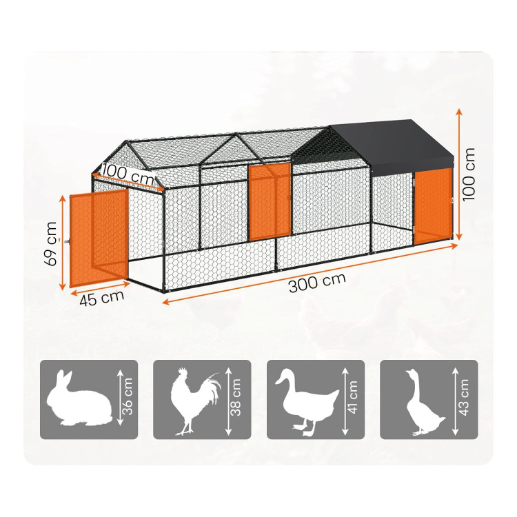 Dzięki długości 300 cm i wysokości do 100 cm, wybieg oferuje zwierzętom mnóstwo przestrzeni do swobodnego poruszania się, nie zajmując przy tym zbyt wiele miejsca w ogrodzie. Idealnie nadaje się do małych i średnich gospodarstw rolnych.