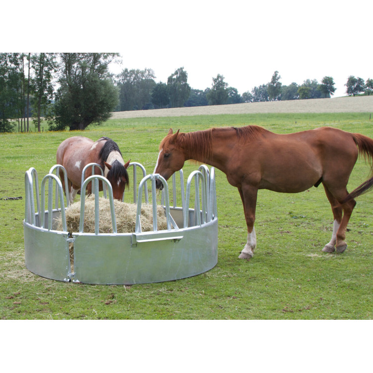 Okrągłe paśnisko dla bydła i koni o średnicy 2,3 m przeznaczone jest do karmienia sianem zarówno ze standardowych, jak i okrągłych bel. Oferuje 12 stanowisk paszowych oraz palisadową barierę paszową, dzięki czemu zwierzęta pobierają paszę z zewnątrz na całym obwodzie, a siano pozostaje wewnątrz paśnika. Dostarczane jest jako 3‑elementowy zestaw do montażu, ma ocynk ogniowy, a dzięki trzypunktowemu zawieszeniu można je łatwo przestawić ciągnikiem.
