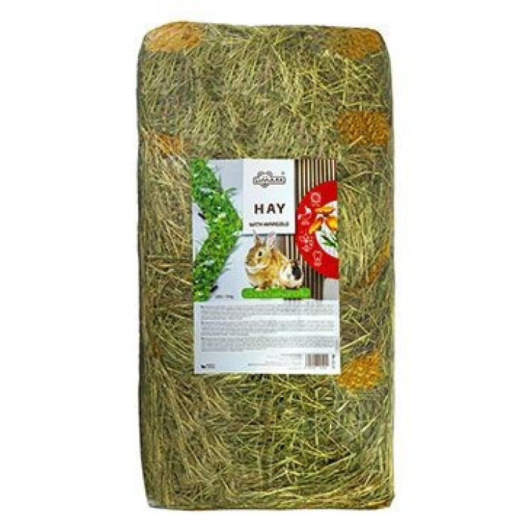 Składniki: siano łąkowe 99% (może zawierać wiązówkę łąkową, owies prażony, wiciokrzew włochaty, kostrzewę czerwoną, turzycę pospolitą, kostrzewę łąkową, dereń pospolity, koniczynę pełzającą, koniczynę łąkową, krwiopijcę, stokrotkę białą, babkę lancetowatą, gatunki dzwonka i inne) , wzbogacony płatkami nagietka 1%.
