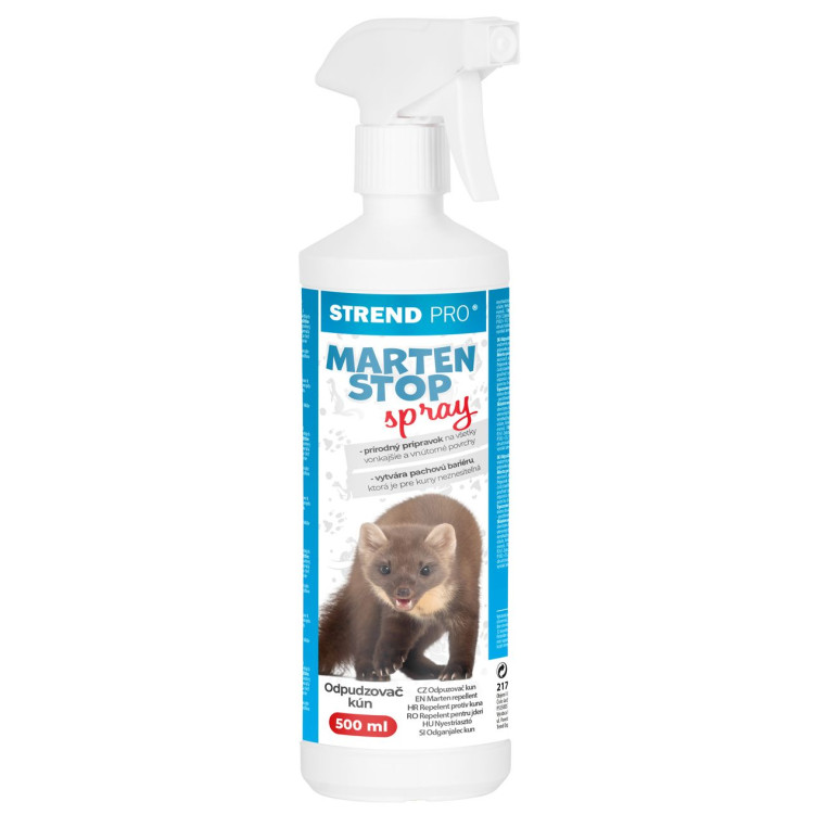 Strend Pro MARTEN STOP to wysoce skuteczny spray chroniący przed kunami. Oparty jest na specjalnych składnikach aromatycznych, niewyczuwalnych dla ludzi, ale bardzo nieprzyjemnych dla kun. Po aplikacji tworzy warstwę ochronną odporną na ciepło i warunki atmosferyczne, zapewniającą długotrwałą ochronę. Nadaje się do stosowania na elementach plastikowych, zabezpieczonych instalacjach elektrycznych, w domu, na strychach i w garażach.
